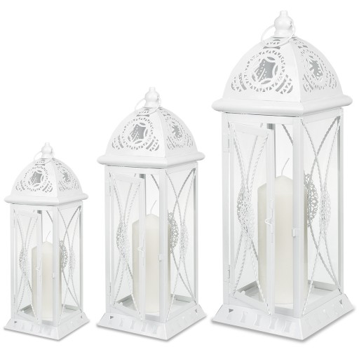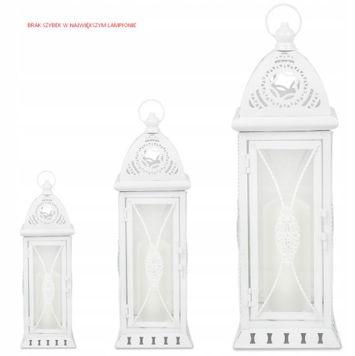 Przedstawiamy Państwu metalową latarnię, lampion w kolorze białym przecierany. Jest to komplet składający się z 3 sztuk- dużej, średniej oraz małej latarni.