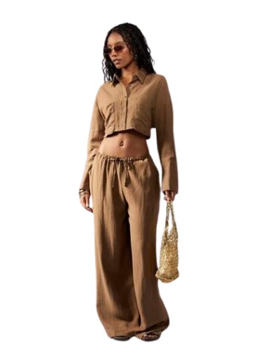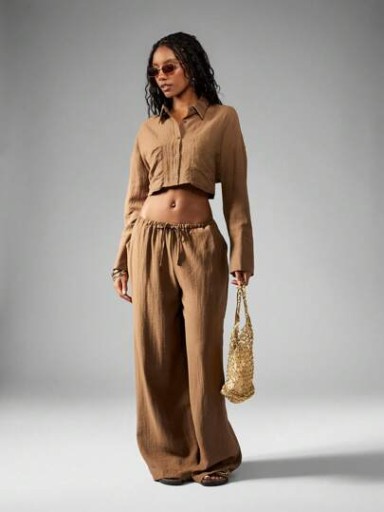 MISSGUIDED DASMKI KOMPLET KOSZULA KRÓTKA I SPODNIE Z LNEM BRĄZOWY