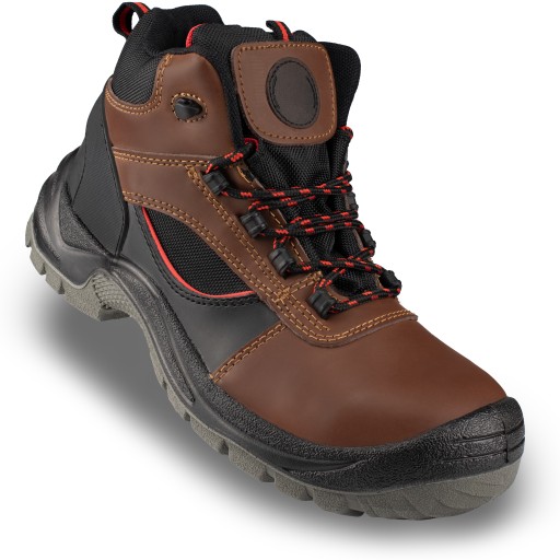 ✔️ TRZEWIKI ŁĄCZĄ FUNKCJONALNOŚĆ Z ESTETYKĄ – brązowa skóra licowa i czarne wstawki z czerwonymi akcentami nadają im nowoczesny wygląd.