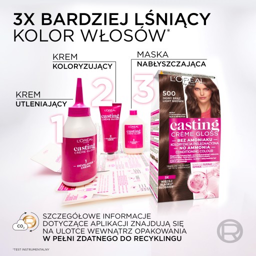 Odkryj nowy Casting Creme Gloss. Szybka i łatwa w użyciu koloryzacja BEZ AMONIAKU zapewniająca wyjątkowo lśniące włosy i optymalne pokrycie siwych włosów. 3X WIĘCEJ BLASKU*, WIDOCZNIE ZDROWSZE WŁOSY I OPTYMALNE POKRYCIE SIWYCH WŁOSÓW. 10% KOMPLEKS GLYCOLIC GLOSS Z KWASEM GLIKOLOWYM. Casting Creme Gloss został wzbogacony o Kwas Glikolowy znany z pielęgnacji skóry na najwyższym poziomie. Jak działa formuła? Intensywnie pielęgnuje i koloryzuje, zapewniając widocznie zdrowsze, bardziej lśniące włosy i optymalne pokrycie siwych włosów. Otula włókna włosów, nadając im długotrwały, lustrzany blask.