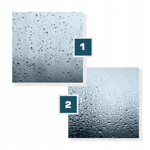 Nasze szyby posiadają powłokę ochronną gwarantującą skuteczne i długotrwałe zabezpieczenie odpornością hydrolityczną oraz utrzymanie wysokich walorów estetycznych wyrobu. Cienka warstwa polimerowa wypełnia mikroskopijne wgłębienia w szkle, co czyni je idealnie gładkim. Dzięki właściwościom hydrofobowym krople wody nie utrzymują się na powierzchni szkła, tylko spływają, redukując znacznie pozostawianie osadów (1. szkło z powłoką vs. 2. szkło bez powłoki).
