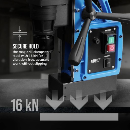 - Stabilne wiercenie – wiertarka elektromagnetyczna ściśle przylega do powierzchni stalowych z siłą 16 kN i zapewnia precyzyjną pracę bez drgań i przesuwania się