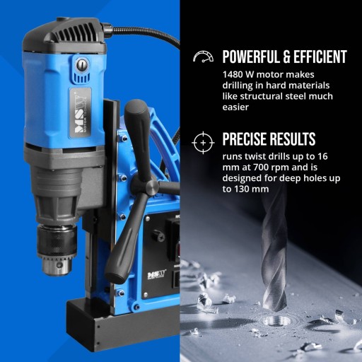 Wiertarka magnetyczna marki MSW wyróżnia się wydajnym silnikiem o mocy 1480 W, który umożliwia niezawodne wiercenie nawet w twardych materiałach, takich jak stal konstrukcyjna. Dzięki prędkości obrotowej 700 obr./min pracuje ona wyjątkowo precyzyjnie. Trzpień Weldon zapewniający wysoki moment obrotowy i odporność na skręcanie nadaje się do wierteł spiralnych do 16 mm przy maksymalnej głębokości 130 mm.