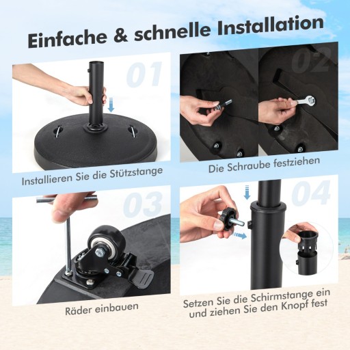 Bezpieczeństwo i stabilność: Solidny okrągły stojak na parasol ma wymiary 52 x 41,5 cm (średnica x wys.) i waży 23 kg, czyli jest wystarczająco duży i ciężki, aby wytrzymać wiatr. Dostępny jest również regulowany stały przycisk stabilizujący kierownicę, który zapobiega chybotaniu.