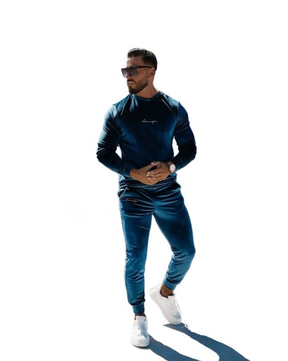 Komplet męski OLV wykonany z miękkiego w dotyku weluru. Góra - delikatnie oversiz’owa bluza, na przodzie pisany haft z logo marki OLAVOGA. Dół - sportowe spodnie z kieszeniami po bokach. Ściągacz w talii. Na jednej z nogawek pisany haft z logo marki.