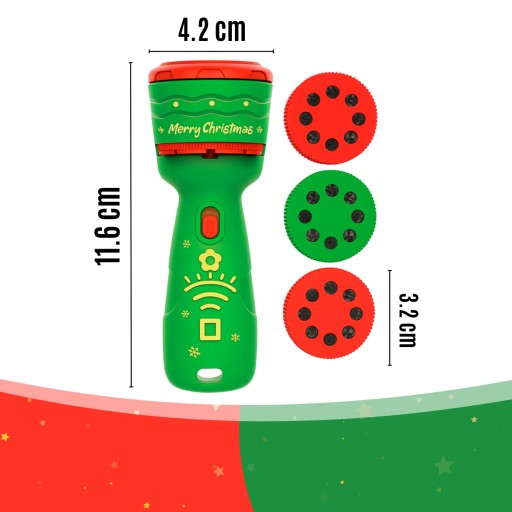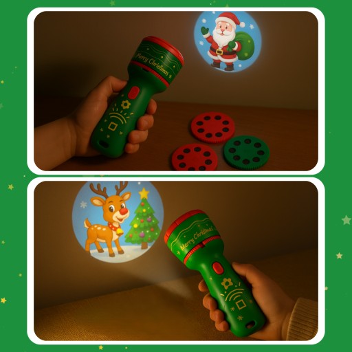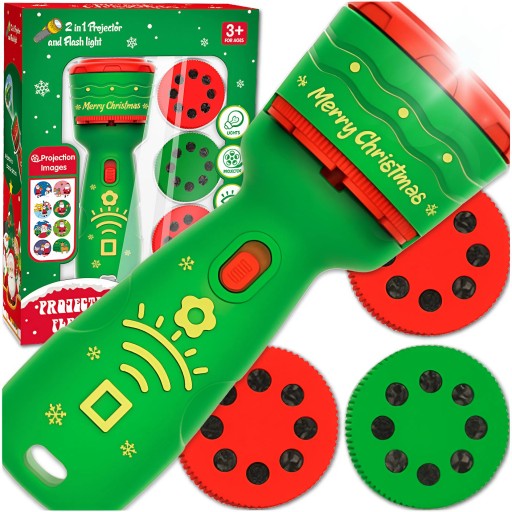 Ta świąteczna latarka-projektor łączy w sobie funkcję latarki i rzutnika obrazków, tworząc niepowtarzalny efekt świetlno-bajkowy. W zestawie znajdziesz 3 kolorowe dyski z 24 świątecznymi slajdami, które rozświetlą pokój bajkowymi ilustracjami.