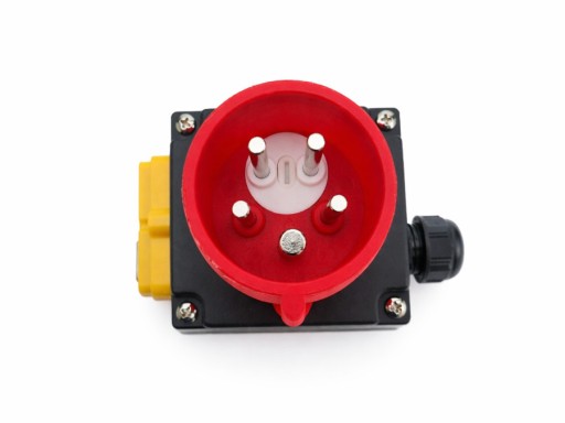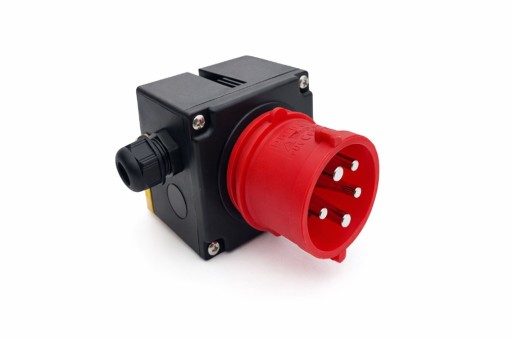 - Zintegrowane Gniazdo 16A: Wyłącznik wyposażony jest w standardowe, czerwone gniazdo siłowe 5-pinowe (3P+N+E), co pozwala na szybkie i pewne podłączenie zasilania.