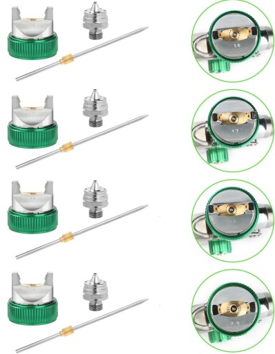 Zestaw dysz o różnych rozmiarach do profesjonalnego pistoletu lakierniczego HVLP: 1,4 mm, 1,7 mm, 2,0 mm oraz 2,5 mm. Każdy rozmiar dyszy zapewnia precyzyjną aplikację farby, dostosowaną do różnorodnych zastosowań i potrzeb lakierniczych.