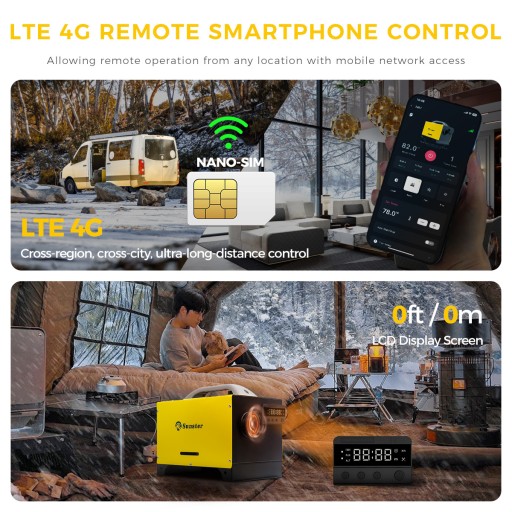 - Sterowanie GSM/LTE 4G (zdalne sterowanie telefonem) – Dzięki obsłudze sieci LTE 4G możesz sterować ogrzewaniem z dowolnego miejsca za pomocą smartfona i karty nano-SIM (karta SIM nie jest dołączona). Włączaj, wyłączaj i monitoruj urządzenie bez ograniczeń zasięgu.