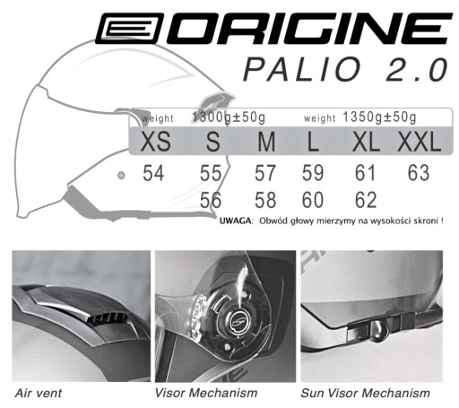 Linia Palio 2.0 charakteryzuje się wyjątkowo długą szybą, która zapewnia wysoki komfort podróżowania. Wizjer wykonany jest z materiału odpornego na zarysowania a jego powierzchnia odbija promienie UV. Aby jazda w słoneczny dzień nie stanowiła problemu kask został wyposażony w blendę przeciwsłoneczną wysuwaną jednym szybkim ruchem dłoni. Bez przeszkód można to zrobić bez ściągania motocyklowych rękawiczek. System wentylacji posiada regulowany przedni wlot powietrza, który w połączeniu z tylnym zapewnia komfort nawet w upalny dzień. Aby w pełni zapewnić stabilność na głowie kask został wyposażony w tylny spojler który stabilizuje go podczas jazdy z wyższą prędkością. Aby utrzymać kask w czystości posiada całkowicie wyjmowane i przystosowane do prania wnętrze. Wyposażony jest w zapięcie mikrometryczne. Kask posiada europejską homologację ECE 22-06 co gwarantuje wysoki poziom bezpieczeństwa.