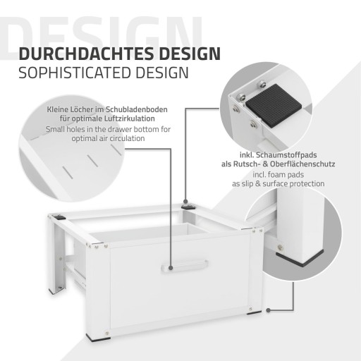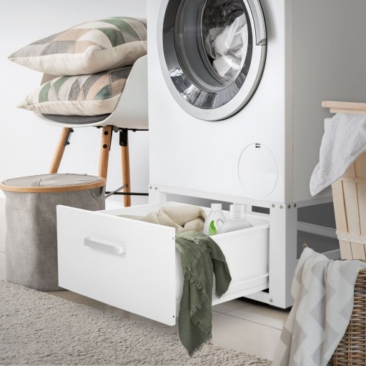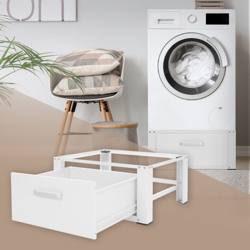 Podnieś swoją pralkę i suszarkę bębnową do ergonomicznej wysokości roboczej 31,5 cm i odciąż swoje plecy dzięki naszej wytrzymałej ramie podstawy pralki. Solidna konstrukcja zapewnia stabilną podstawę, a praktyczna powierzchnia do przechowywania oferuje praktyczne rozwiązanie dla akcesoriów do prania. Dzięki szufladzie zawsze masz dostęp do akcesoriów do prania. Szuflada jest wykonana ze stali i ma aluminiowy uchwyt. Idealna do małych przestrzeni, nasza rama pod pralkę to inteligentne rozwiązanie, które pozwala zaoszczędzić miejsce i ułatwia pranie.