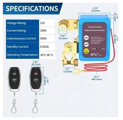 Zdalny automatyczny wyłącznik odłącznik akumulatora 12V 240A 2x pilot