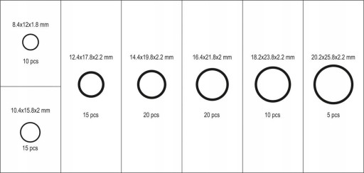 - Zawartość zestawu: podkładki x95 (Ø8.4x12x1.8 mm x10, Ø10.4x15.8x2 mm x15, Ø12.4x17.8x2.2 mm x15, Ø14.4x19.8x2.2 mm x20, Ø16.4x21.8x2 mm x20, Ø18.2x23.8x2.2 mm x10, Ø20.2x25.8x2.2 mm x5)