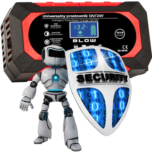 Prostownik został wyposażony w inteligentny mikroprocesor, który w razie powstania niepożądanych sytuacji mogących skutkować niebezpieczeństwem i zagrożeniem zdrowia i życia odcina moc.