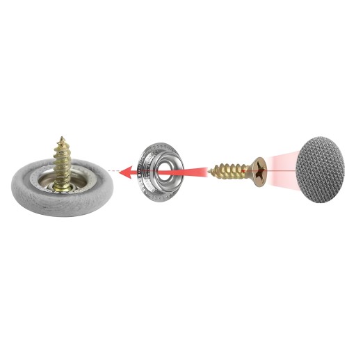 Po stabilnym przykręceniu podstawy, nałóż główną część nitu lub pinezki. Elementy pewnie zatrzaskują się i nie przemieszczają.