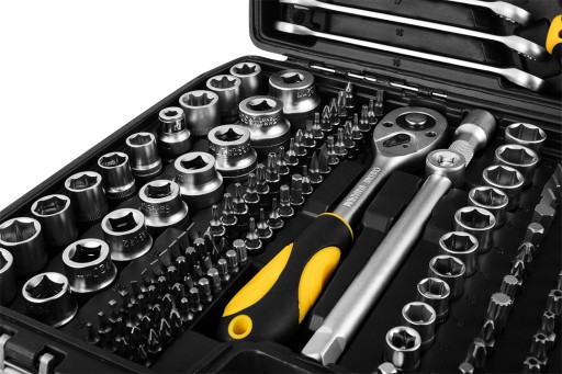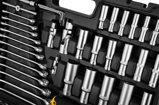 Wykonane z wytrzymałej stali chromowo-wanadowej (CrV) narzędzia cechują się wysoką odpornością na ścieranie i korozję. Ergonomiczne rękojeści w grzechotkach gwarantują komfort użytkowania nawet podczas długiej pracy.