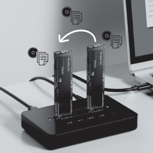 Jedną z najważniejszych funkcji stacji jest możliwość klonowania offline – bez użycia komputera. Wystarczy podłączyć zasilanie, umieścić oba dyski w slotach i uruchomić proces klonowania jednym przyciskiem.