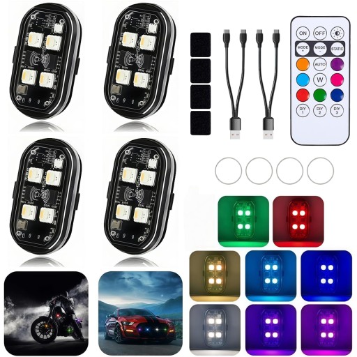 🌈💡4 ulepszone bezprzewodowe światła stroboskopowe LED z 4 diodami LED i pilotem, 8 kolorów, akumulatorowe światła LED typu C, światła ostrzegawcze przed kolizją do samochodów, motocykli, rowerów, dronów i samolotów🌈💡🚗