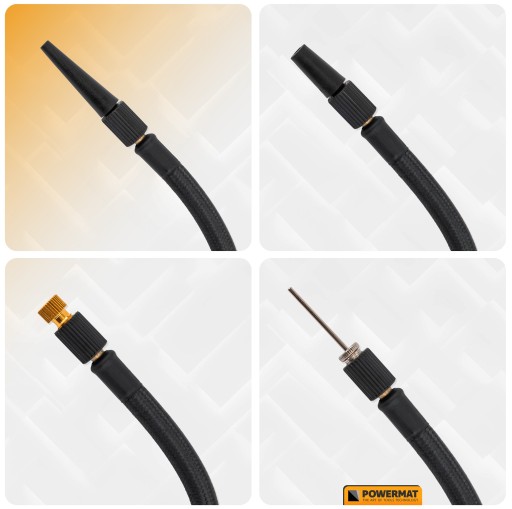 Kompresor wyposażono w zestaw wymiennych końcówek, dzięki którym można precyzyjnie dopasować narzędzie do różnych typów zaworów.