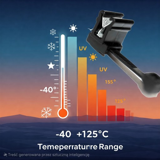 - Podwyższona wytrzymałość termiczna (+125°C): W przeciwieństwie do standardowych opasek (do 85°C), ten model wykonano z poliamidu stabilizowanego termicznie. Opaski nie kruszeją od gorąca silnika czy rozgrzanych paneli słonecznych.