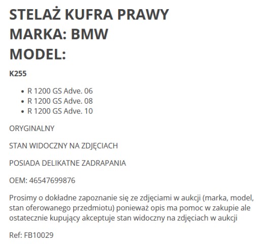 Prosimy o dokładne zapoznanie się ze zdjęciami w aukcji (marka, model, stan oferowanego przedmiotu) ponieważ opis ma pomoc w zakupie ale ostatecznie kupujący akceptuje stan widoczny na zdjęciach w aukcji