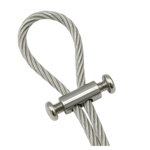 - Umieść oba końce linki stalowej w przelotowych otworach zacisku.