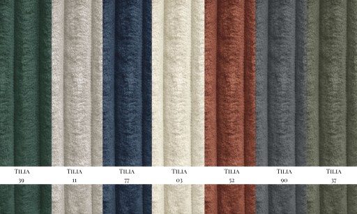Tkanina Tilia to nowoczesny, gruby sztruks o charakterystycznych, szerokich ok. 2,5 cm prążkach. Wyróżnia się bardzo miękkim, „pluszowym” włosiem, co nadaje jej ciepły i przytulny wygląd. Jest to trwały materiał obiciowy, odporny na ścieranie (powyżej 90 000 cykli w teście Martindale’a), mechacenie i tarcie.