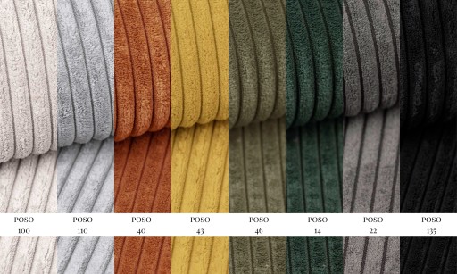 Welurowa tkanina obiciowa Poso to nowoczesna interpretacja klasycznego sztruksu. Jej charakterystyczne, głębokie rowki nadają tapicerowanym meblom wyjątkowo przytulny i domowy charakter, a nasycone pigmentami kolory dodatkowo podkreślają ich elegancję.