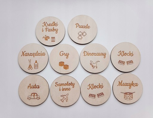 Drewniane plakietki z piktogramami wykonane są z wysokiej jakości sklejki brzozowej o grubości 3 mm. Każda plakietka ma średnicę 6,5 cm, dzięki czemu jest dobrze widoczna i pasuje do większości pudełek, szuflad oraz organizerów.