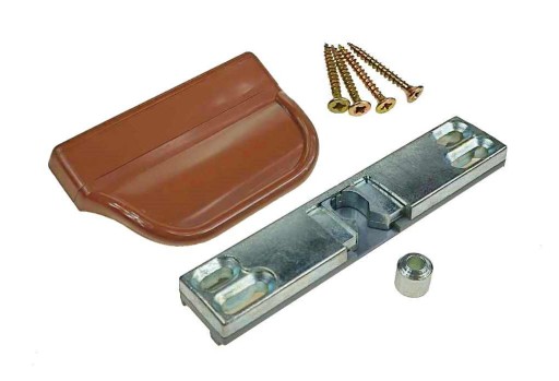 4️⃣ Zatrzask przykręcić wkrętami do ramy drzwi dopasowując miejsce montażu do wysokości rolki na skrzydle, w taki sposób by rolka swobodnie wpadała w rowek zatrzasku. Zatrzask dedykowany do każdej marki profili PCV, sugerujemy przykręcać go dwoma wkrętami po wewnętrznej krawędzi drzwi.