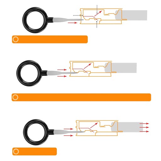 Większość wiązek przewodów jest zabezpieczona za pomocą zadziorów. Za pomocą narzędzia można podnieść lub spłaszczyć zadziory, a następnie ostrożnie wyciągnąć końce przewodów. Należy zwrócić szczególną uwagę na siłę i kierunek pociągnięcia.
