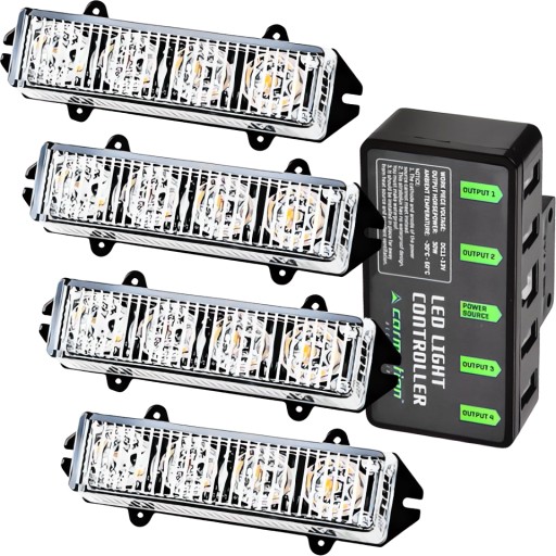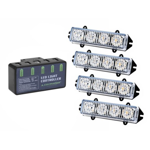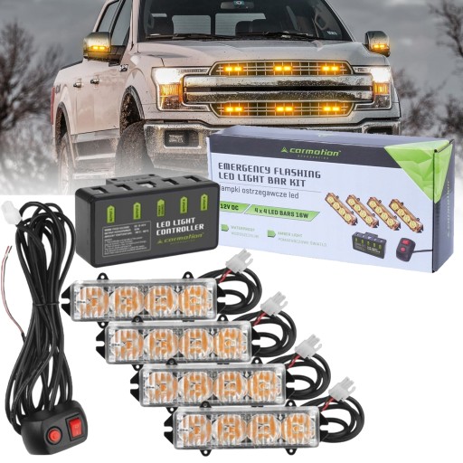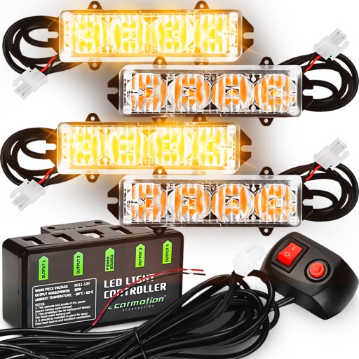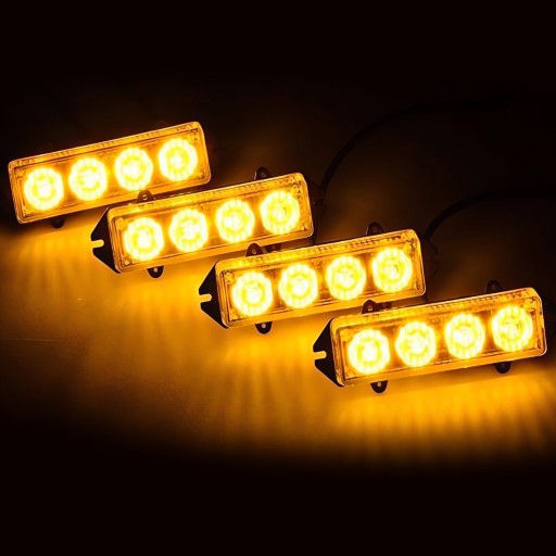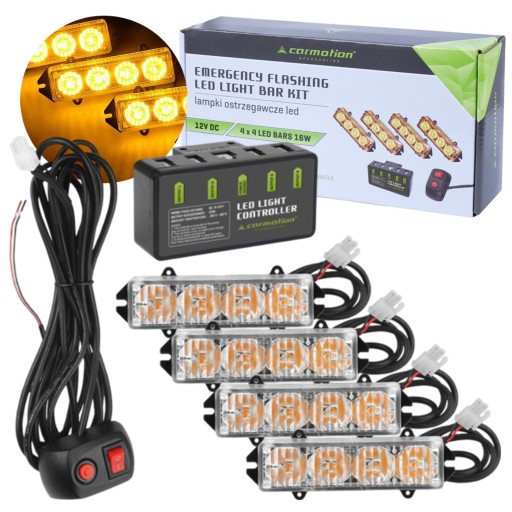 Profesjonalny zestaw 4 lamp stroboskopowych LED DC 12V. amp;amp;amp;amp;amp;nbsp;Zestaw jest podświetlany pomarańczowym światłem, wiele programów świetlnych można wybierać za pomocą kontrolera, wodoodporne światła stroboskopowe. amp;amp;amp;amp;amp;nbsp;Zestaw 16W (4 x 4 diody LED).