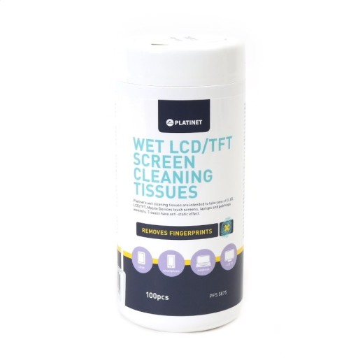 Chusteczki czyszczące do monitorów TFT/LCD. 100 nawilżanych chusteczek marki Platinet idealnie nadających się do czyszczenia monitorów i telewizorów LCD/TFT. Usuwają tłuste plamy, odciski palców i inne zanieczyszczenia, jednocześnie są bezpieczne i nie uszkadzają ekranu. Pozostawiają antystatyczną powłokę zabezpieczającą przed ponownym osadzaniem się brudu. Wymiary chusteczek: 13 x 20 cm Wymiary opakowania zbiorczego-kartonu (dł/szer/wys): 25,5/32,5/19,5cm ilość w kartonie : 12szt