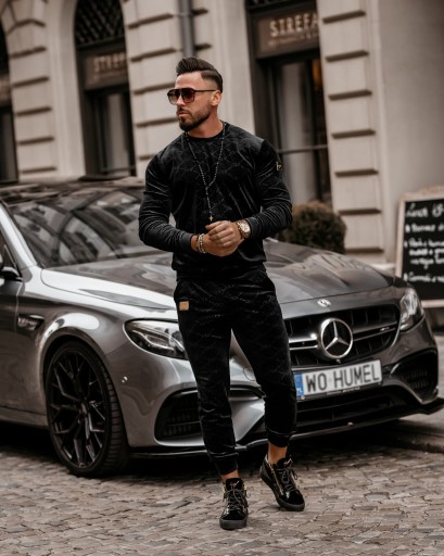 Casualowy, logowany komplet z miękkiego, przyjemnego w dotyku weluru. Luźny fason bluzy, rękawy i nogawki zakończone ściągaczem. Na górze nogawki oraz na rękawie złota, ozdobna metalowa naszywka z logo OLV.
