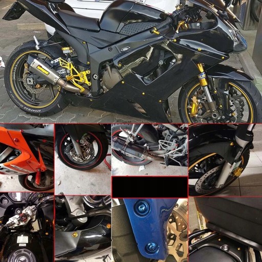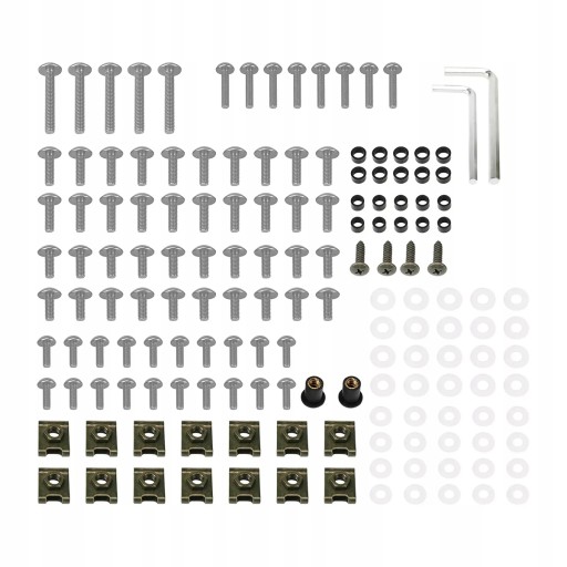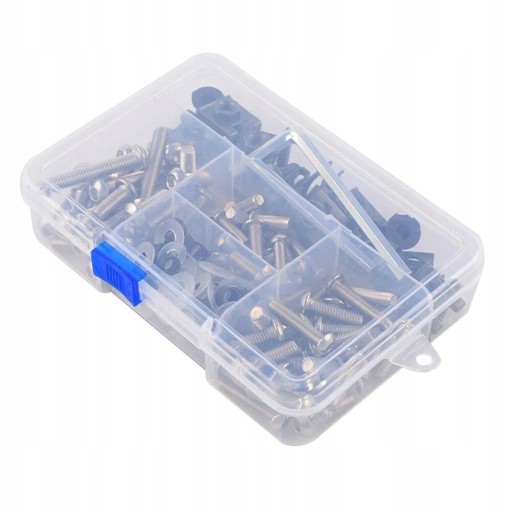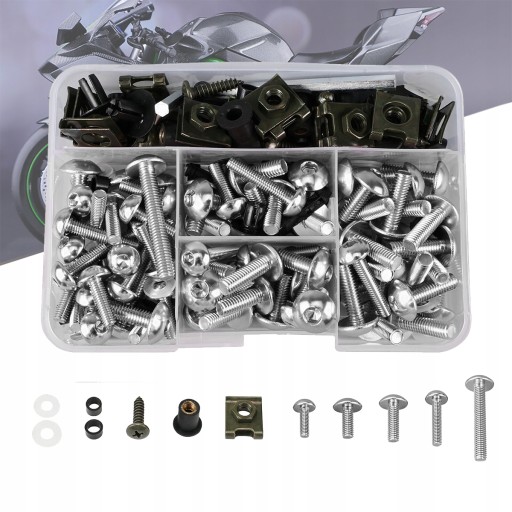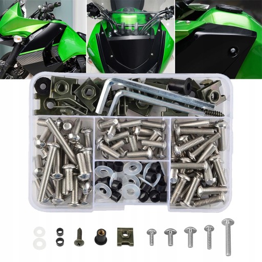 -- Zestaw zawiera 155 elementów wysokiej jakości, fabrycznych, metrycznych, w tym śruby imbusowe, śruby z łbem stożkowym, śruby kołnierzowe, śruby do owiewek z podkładkami nylonowymi, mocowania szyby przedniej i wiele innych.