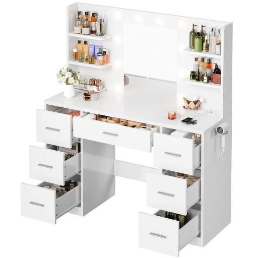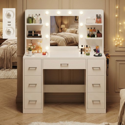 - 【Przestronne biurko Vanity z 7 szufladami】 Ta toaletka posiada 7 szuflad i 4 otwarte półki, zapewniając dużo miejsca do przechowywania. Zgrabnie uporządkuj swoje kosmetyki, produkty do pielęgnacji skóry i różne akcesoria, aby mieć do nich łatwy dostęp — nawet większe przedmioty można pomieścić, tworząc uporządkowaną i wydajną toaletkę. Rozległy pulpit o szerokości 110 cm jest idealny do codziennej rutyny makijażu, a także może podwoić się jako wygodne tymczasowe miejsce pracy w razie potrzeby.