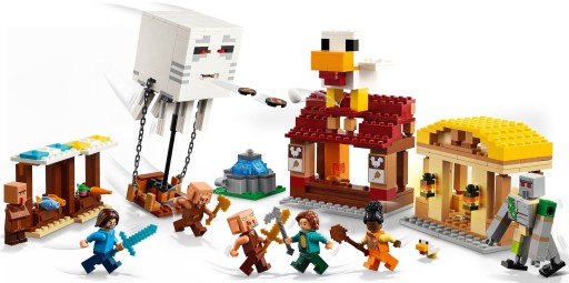 Zestaw zawiera popularne postacie z gry: Steve’a, Natalie, Dawn, dwa pigliny, balonowego ghasta, osadnika, małego kurczaka i ruchomą figurkę żelaznego golema. W balonie jest miejsce dla piglinów i miotacz dysków. W wiosce są stragany na rynku, restauracja Steve’a ze smażonymi kurczakami, jego warsztat i fontanna, którą dzieci mogą „wysadzić” za pomocą wbudowanej funkcji. Dach restauracji zdobi duży model kurczaka z zabawną funkcją znoszenia jaj.