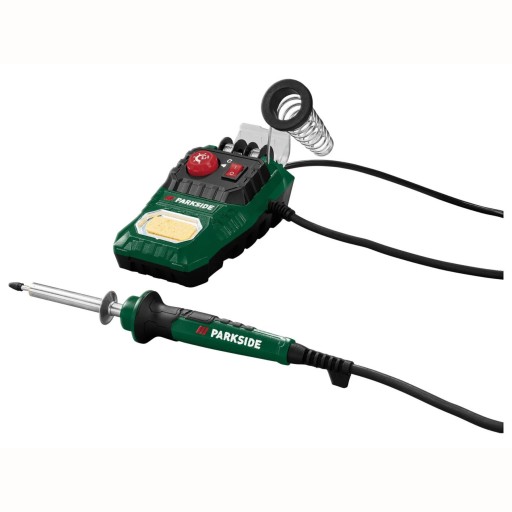 - w zestawie: 1 końcówka wymienna (kształt płaski), 1x gąbka do czyszczenia, 2 szpule cyny lutowniczej po 5 g (grubość 1,5 mm / 1,0 mm)