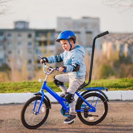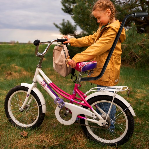 Ergonomiczna, gumowa rączka zapewnia komfort i pewny chwyt podczas prowadzenia roweru dziecka.