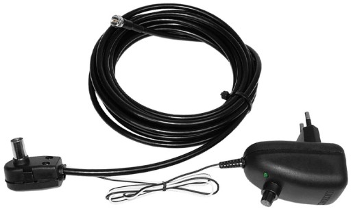 Uzupełnieniem do wyżej wymienionej anteny jest zasilacz antenowy, sieciowy, regulowany 230V/12V 100mA 50Hz z wyprowadzonym pokrętłem umożliwiającym płynną regulację wzmocnienia wraz z gotowym do podłączenia przewodem antenowym o długości 2m.