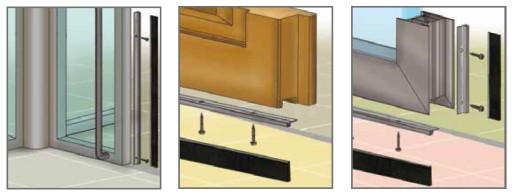 Uszczelnienia szczotkowe na profilach kątowych "F" standardowo montowane są od spodu drzwi za pomocą wkrętów montażowych. Dzięki takiemu montażowi, profil aluminiowy jest niewidoczny.