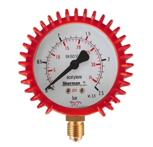Manometr zegarowy do reduktorów butlowych spawalniczych z osłoną gumową. Zegar działa na zasadzie sprężystego odkształcenia sprężyny rurkowej Bourdona pod wpływem zmiany zadanego ciśnienia.