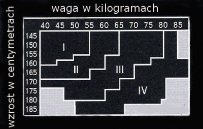Przecięcie linii wagi i wzrostu wskazuje pole z właściwym rozmiarem.