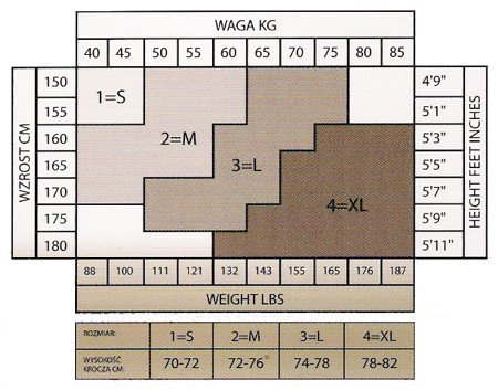 Przecięcie linii wagi i wzrostu wskazuje pole z właściwym rozmiarem. Prosimy o zakupy na aukcjach z właściwym rozmiarem.