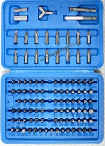 Komplet końcówek do wiertarki/wkrętarki 100 elementów wykonanych z bardzo dobrej jakości materiałów. Bity zapakowane w plastikową, wygodną do przechowywania walizeczkę.