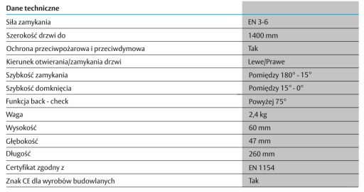 Samozamykacz z mechanizmem zębatkowym. Stosowany w drzwiach prawych/lewych, przeciwpożarowych i dymoszczelnych o szerokości skrzydła do 1400 mm. Siła zamykania 3-6 zgodnie z normą EN1154. Odporny na wahania temperatury (nawet do -35°C) dzięki zaworom termodynamicznym.