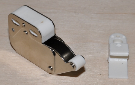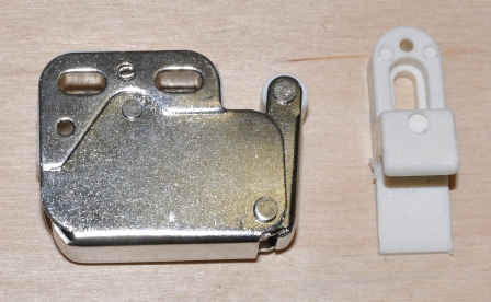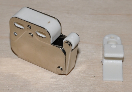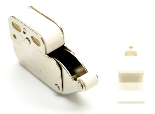 Opis: bardzo mocny zatrzask wykonany z blach ocynkowanej (ocynk srebrny) a zaczep wykonany z tworzywa w kolorze białym. Zatrzask w swojej obudowie posiada sprężynę i zapadkę, dzięki czemu ramię z dużą siłą się wychyla i bardzo pewnie blokuje po wciśnięciu. Zatrzask jest mocny i gwarantuje długą i bezawaryjną obsługę. Zatrzask przeznaczony jest do zamykania frontów meblowych bez uchwytów. Otworzenie drzwi następuje po naciśnięciu frontu. Aby zatrzask mógł prawidłowo funkcjonować drzwi (fronty) powinny być wyposażone w zawiasy odpychające.