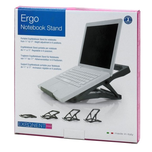 Jeśli jesteś osobą, która dużo pracuje na laptopie, w biurze, w podróży czy też w domu, a jednocześnie cenisz sobie wygodę pracy, zdrowie, elegancję oraz korzystną cenę - mamy coś odpowiedniego dla Ciebie. Przenośna podstawka pod laptopa włoskiej marki Exponent World umożliwia wygodną pracę na laptopie o przekątnej ekranu od 11" do 17". Wyposażona została w antypoślizgowe podkładki, które przez cały czas utrzymują urządzenie w odpowiedniej, stabilnej pozycji. Istnieje możliwość ustawienia podstawki pod laptopa aż w sześciu różnych pozycjach, co pozwala na łatwe dopasowanie jej do zajmowanej podczas pracy pozycji. Jeśli dużo pracujesz poza biurem, często podróżujesz, nie stanowi to żadnego problemu. Prezentowana podstawka pod laptopa marki Exponent z łatwością się składa. Po złożeniu ma zaledwie 3 cm grubości. Włoska firma wyprodukowała podstawkę w klasycznym, czarnym kolorze przy użyciu wysokiej jakości tworzywa sztucznego. Zadbała również o jej elegancki wygląd. Komfort użytkowania, elegancja, niska cena - wszystkie te cechy wyróżniają podstawki pod laptopa włoskiej marki Exponent World.