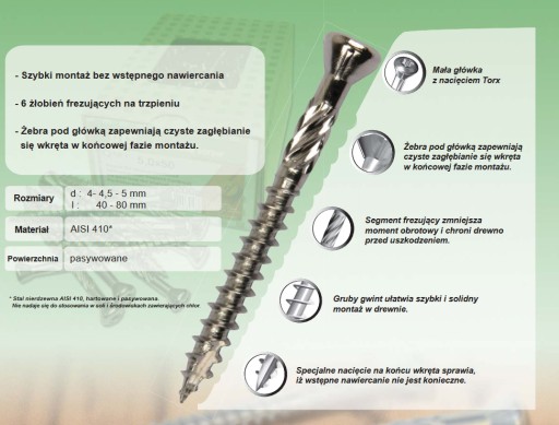 - frezujące żebra pod główką - ułatwiają osadzenie i sprawiają, że wkręt idealnie licuje z podłożem,
