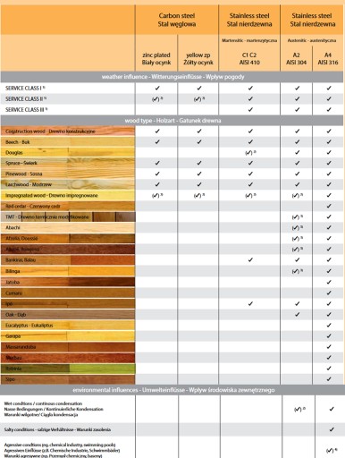- wysoka wytrzymałość (wyższa nawet o 60% od stali nierdzewnej A2) i możliwość penetracji nawet najtwardszego drewna dzięki poddaniu wkręta hartowaniu (utwardzaniu),